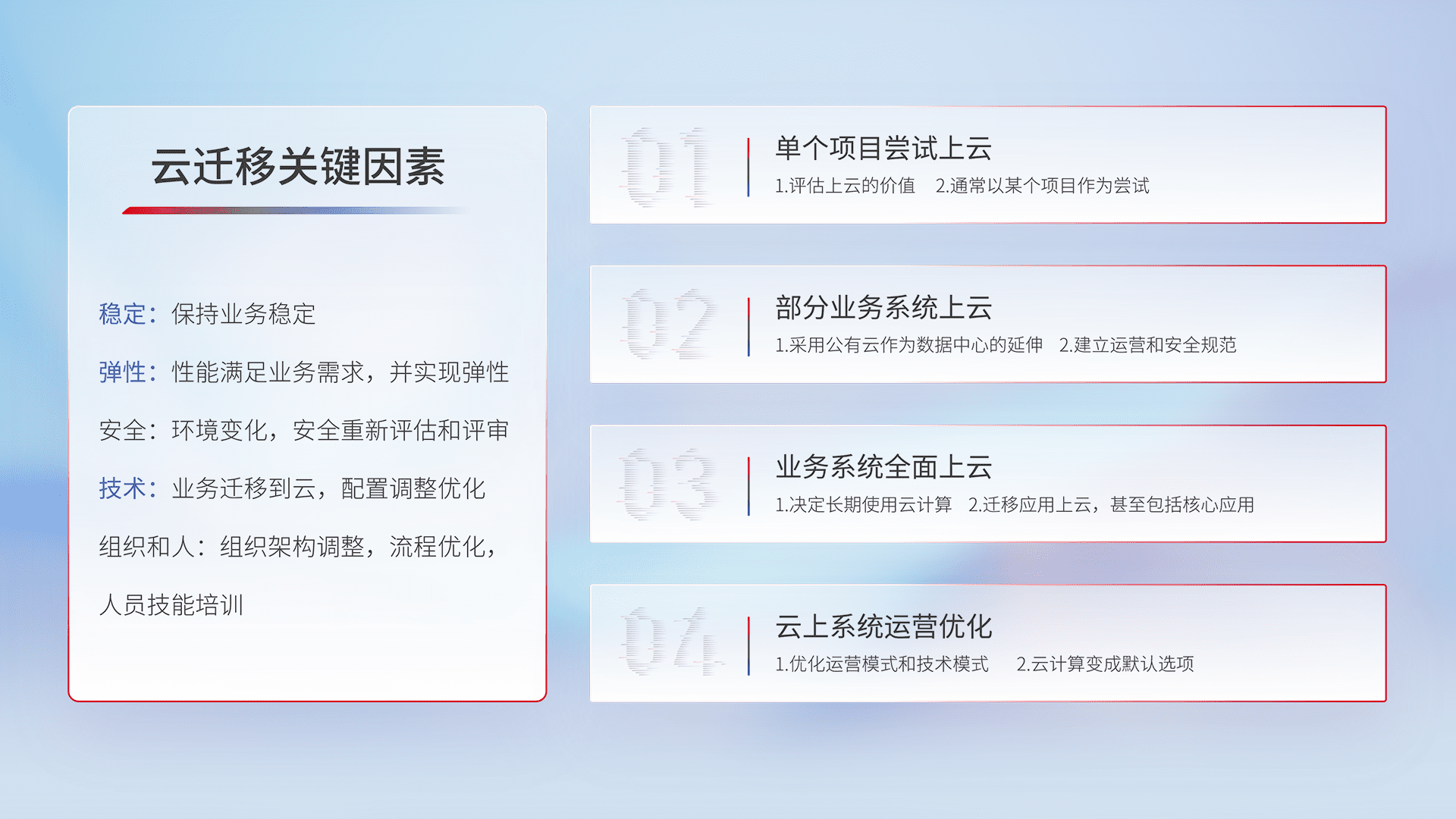 结合实际业务,,从规划设计、、、、云平台选型、、、云原生改造、、、、数据迁移、、、、集成交付,,,迁移全过程为客户识别最佳上云路径,,,,做好风险识别管理,,设计网络架构、、身份权限、、、、安全审计合规、、、、操作审计、、日志审计、、、监控告警策略、、、、多站点容灾设计等,,,,对云上基础设施进行整体规划,,提升IT治理水平,,,以满足弹性、、高可用、、、、高性能的需求。。
