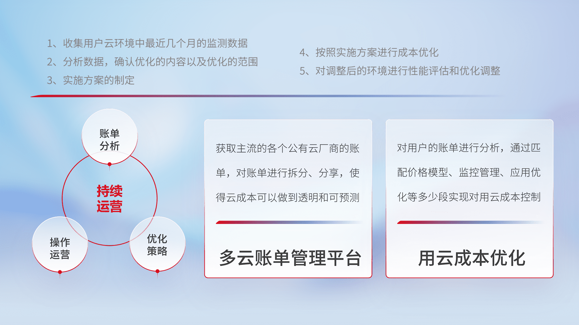 通过多云纳管,,以统一的资源数据模型把客户的云资源进行抽象和封装,,,,进而实现对多云资源的统一操作,,,,保障云资源管理的可靠性、、、稳定性与可用性。。量身定制化运维内容,,,,配置、、开发运维、、、、补丁管理、、备份、、、、监控、、、、认证和访问管理、、审计和日常巡检等,,,保障在用云过程中的可靠度,,,稳定度以及高可用率。。。。